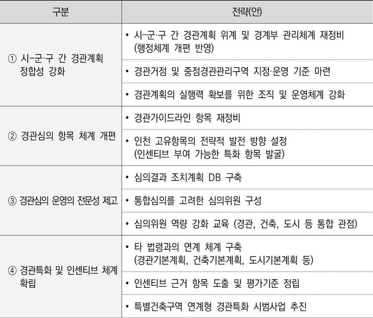 이에 인천 경관정책을 관리 중심에서 창의적 경관 형성 체계로 전환하기 위한 네 가지 방향으로 ‘시 군·구 간 경관계획 정합성 강화’, ‘경관심의 항목 체계 개편’, ‘경관심의 운영 전문성 제고’, ‘경관특화 및 인센티브 체계 확립’을 설정했다.