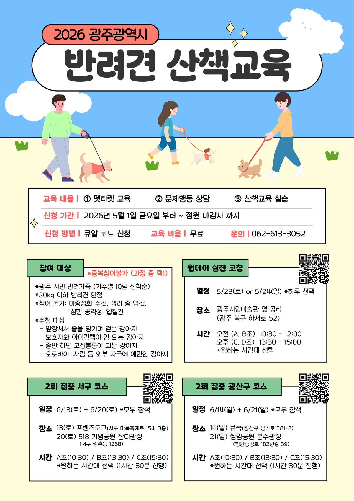 먼저 ‘원데이 실전 코칭’은 5월 23일과 24일 광주시립미술관 옆 잔디밭에서 진행하며 짧은 시간 안에 반려견의 올바른 산책 습관 형성과 외부 자극 적응력을 높이는 데 초점을 맞췄다.