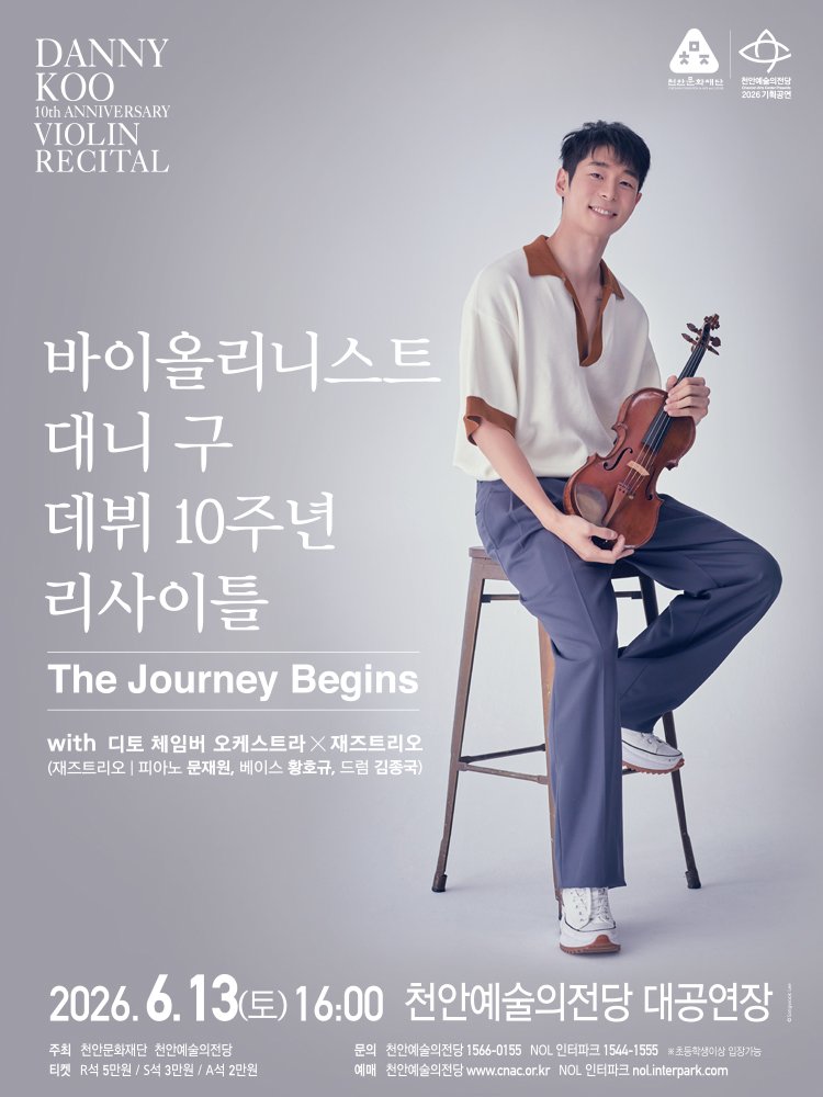 [충청뉴스큐] 천안문화재단은 오는 6월 13일 천안예술의전당 대공연장에서 바이올리니스트 대니 구 데뷔 10주년 기념 리사이틀 ‘The Journey Begins’를 개최한다고 29일 밝혔다.