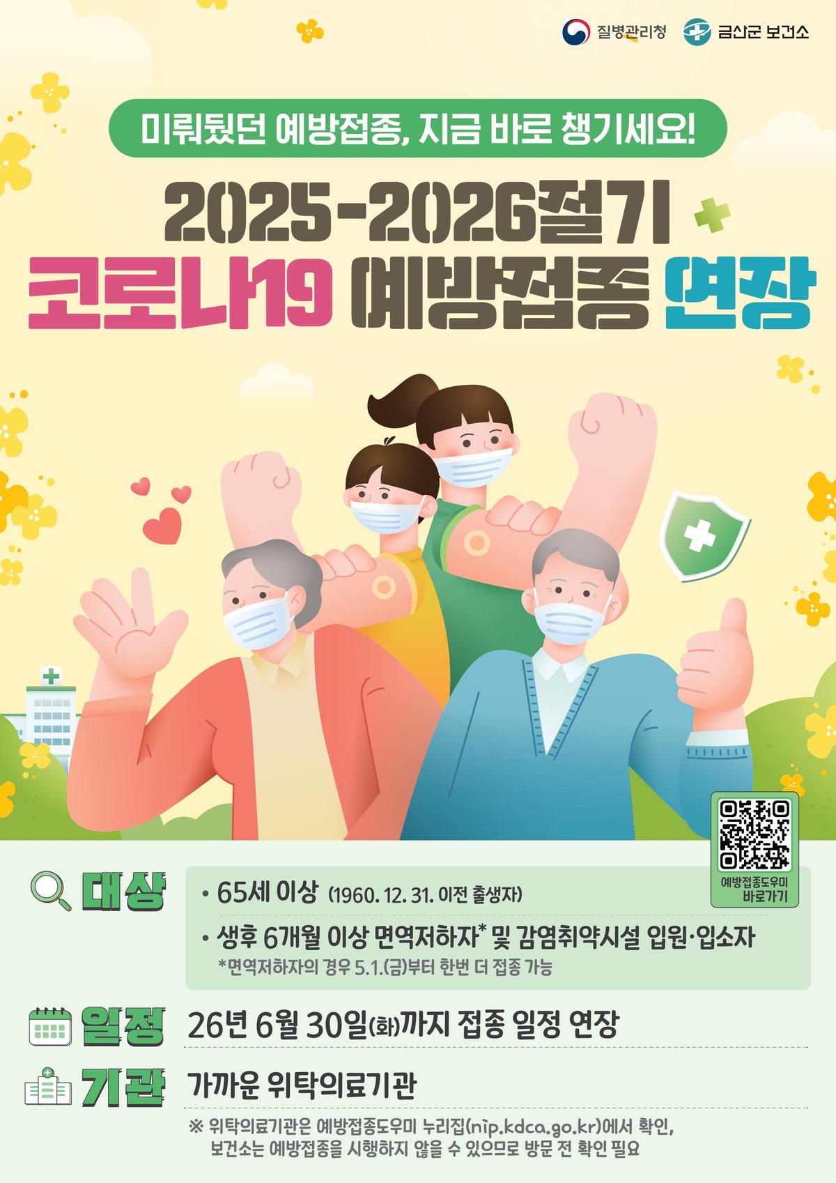 [충청뉴스큐] 금산군은 군민의 감염병 예방을 통한 군민 건강을 지키기 위해 당초 4월 30일 종료 예정이었던 2025-2026절기 코로나19 예방접종 기간이 오는 6월 30일까지 두 달간 연장된 사살에 대한 안내에 나섰다.