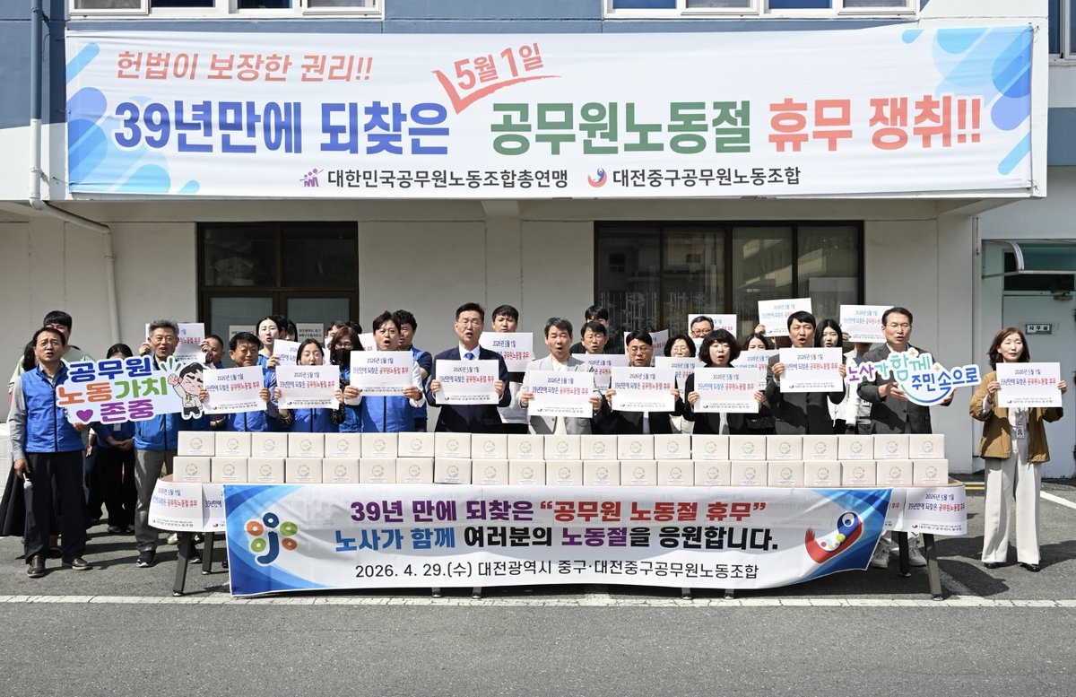 [충청뉴스큐] 대전중구공무원노동조합은 29일 오전 10시 조합 사무실 앞에서 중구청장 및 노동조합 관계자가 함께 ‘39년 만에 되찾은 공무원 노동절 휴무 기념행사’를 개최하고 63년 만에 노동절 명칭 복원과 120만 공무원, 교사 차별 해소를 경축하는 자리를 가졌다고 밝혔다.