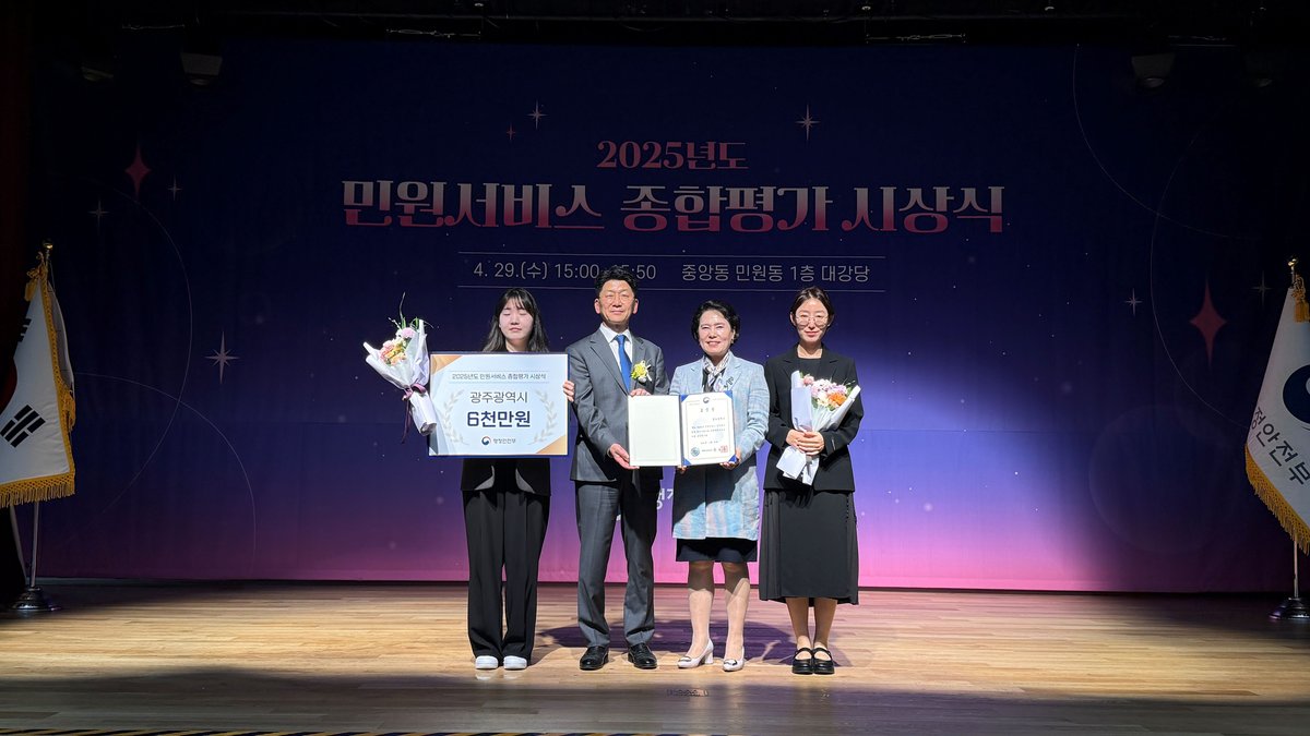 [충청뉴스큐] 광주광역시는 29일 ‘2025년 민원서비스 종합평가’에서 최우수기관으로 선정, 행정안전부 장관 표창과 함께 재정 특전으로 특별교부세 6000만원을 확보했다.
