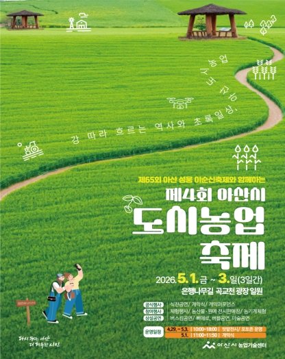 [충청뉴스큐] 아산시는 ‘제65회 아산 성웅 이순신축제’ 와 연계한 ‘제4회 아산시 도시농업축제’를 오는 5월 1일부터 3일까지 3일간 은행나무길 곡교천 광장 일원에서 개최한다.