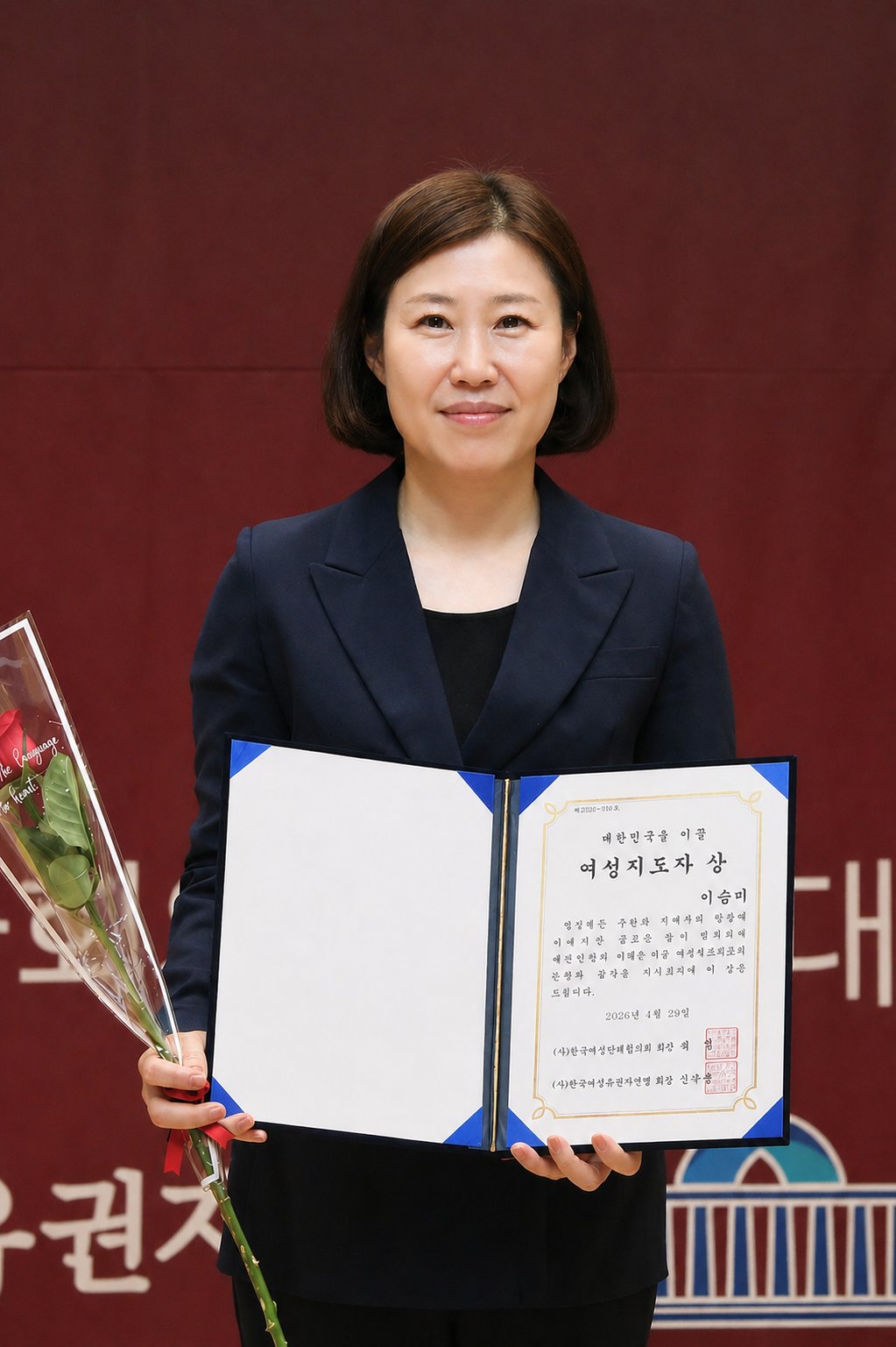 ‘대한민국을 이끌 여성지도자상’은 한국여성단체협의회와 한국여성유권자연맹 등이 공동 주최하며 여성 권익 신장과 양성평등 실현에 기여한 미래지향적 리더에게 수여된다.