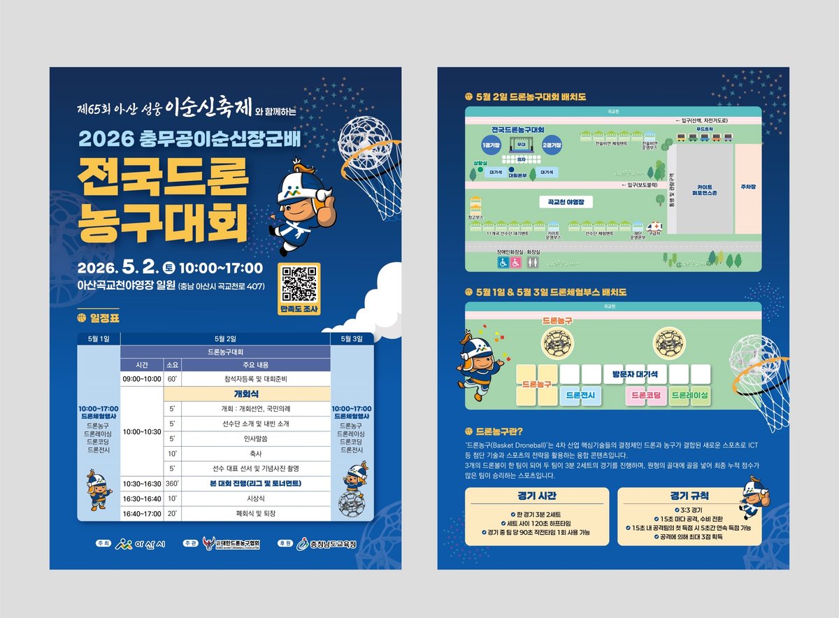 [충청뉴스큐] 아산시는 5월 1일부터 3일까지 사흘간 곡교천 야영장 일원에서 ‘충무공 이순신장군배 전국 드론농구대회’를 개최한다.