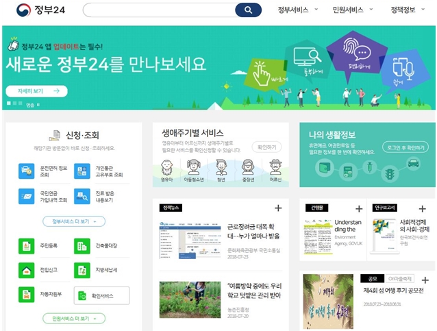 새로운 ‘정부24’는 기존에 정부서비스, 민원, 정책정보로 나뉘어 제공되던 메뉴를 기능 중심으로 통합하고, 자주 찾는 서비스를 한 화면에 배치하여 서비스를 손쉽게 이용할 수 있도록 디자인을 개선했다.