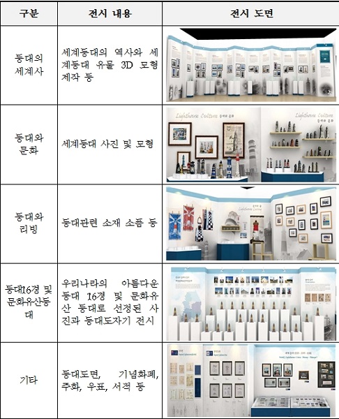 전시 구성을 자세히 살펴보면, 세계 등대의 역사와 해외 등대유물 3D 모형 등을 감상할 수 있는 ‘등대의 세계사’ 세계 등대문화를 소개하는 ‘등대와 문화’ 등대 관련 소재·소품이 전시되는 ‘등대와 리빙’ 우리나라 등대 16경과 문화유산으로 지정된 등대의 사진·모형을 만나볼 수 있는 ‘문화유산등대’ 전시가 진행된다. 이 외에도, 100년 된 우리나라 등대 도면과 외국의 특색 있는 기념화폐·주화·우표·서적 등을 만나볼 수 있다.