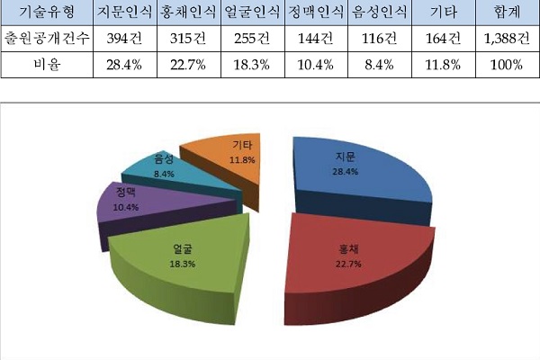 특허청에 따르면, 최근 5년간 생체인식기술에 대한 전 세계 PCT 국제출원 특허협력조약에 의한 국제출원으로, 미국, 유럽 등 전 세계 152개국에 동시에 특허출원한 효과를 갖는다.