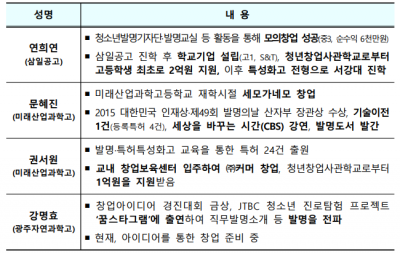 일례로 발명·특허 특성화고 졸업생 연희연씨는 고등학교 재학시절 직접 개발한 발명교구를 특허 등록하고, S&T 스튜처를 창업하여 청년사관학교에 고등학생 최초로 입학하는 등 아이디어와 특허 기술을 바탕으로 창업가의 길을 걷고 있다.