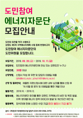 모집인원은 30여명 이내로 12월까지 활동하게 되고, 강원도 내에 주소를 둔 강원도민이면 누구나 참여가 가능하며, 사전교육을 받은 뒤 2회에 걸쳐 에너지자문단 회의에 참여하게 된다.