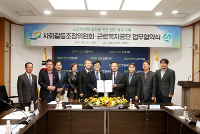 강원도 사회갈등조정위원회는 21일 도청에서 근로자를 위한 사회보장서비스 기관인 근로복지공단 춘천지사와 도민의 권익증진과 고충민원 해소를 위한 업무협약을 체결했다.