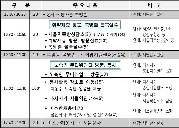 쪽방촌에 거주하는 독거노인을 방문하여 방문 건강진료활동과 골목주변 살수활동에 참여하는 등 일일 재난도우미 역할을 수행하고, 노숙인 무더위쉼터에 방문하여 냉방기와 소방시설 점검과 점심 배식, 얼음물 제공 등 봉사활동에도 참여했다.